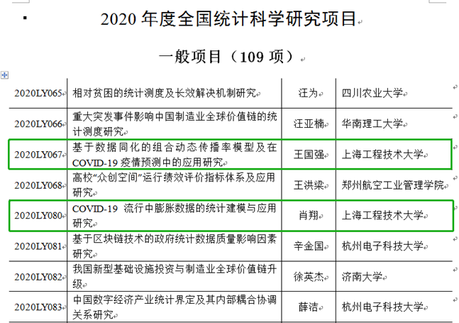 近日,全国统计科学研究组织管理办公室发布了《2020年度全国统计科学研究项目立项公告》,我校英国正版365官方网站王国强教授主持的“基于数据同化的组合动态传播率模型及在COVID-19疫情预测中的应用研究”和肖翔老师主持的“COVID-19流行中膨胀数据的统计建模与应用研究”,经过学校科研处组织、个人申报、专家评审、网络公示等环节,最终获得一般项目立项。据悉,全国统计科学研究项目面向全国申报,选题参照国家统计局发布的课题指南确定。该项目以统计改革和建设中的重大理论及实践问题为主攻方向,努力发展和全面繁荣统计科学。2020年度全国统计科学研究项目共立项157项,其中重大项目8项、重点项目40项、一般项目109项,全国100多个包含国家统计局在内的统计部门和全国高校确定为立项单位。