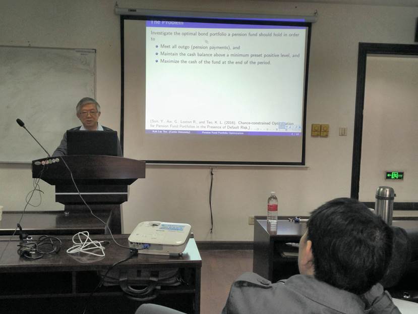 10月23日下午,澳大利亚科廷大学数学与统计系Kok Lay Teo(张国礼)教授应英国正版365官方网站邀请在行政楼1307报告厅为广大师生作题为“Chance-constrained Optimization for Pension Fund Portfolios in the Presence of Default Risk”的学术报告。参加讲座的有英国正版365官方网站、电子电气学院和管理学院等从事统计、优化和控制的教师及研究生。报告会由英国正版365官方网站李路副院长主持。