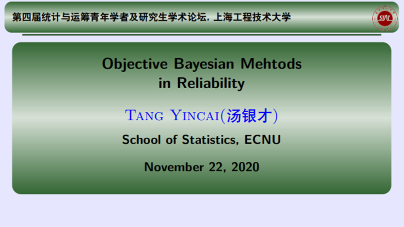 2020年11月22日下午,华东师范大学统计学院汤银才教授应邀参加上海工程技术大学第四届统计与运筹青年学者论坛,通过腾讯会议为广大师生作了题为“客观贝叶斯分析及其在可靠性中的应用”的学术报告,报告会由英国正版365官方网站副院长王国强教授主持。