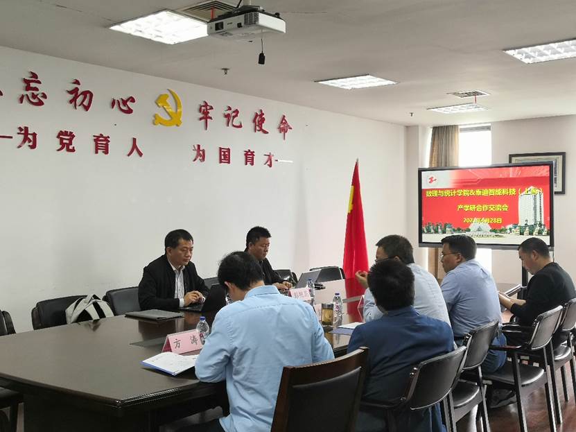 4月28日上午,泰迪智能科技(上海)有限公司总经理彭艳昆、实施总监梁永一行来访英国正版365官方网站洽谈校企合作。英国正版365官方网站院长殷志祥教授、副院长王国强教授、统计与数据计算系主任江开忠副教授、副主任方涛副教授和郑中团副教授出席此次会谈,会议由王国强主持。