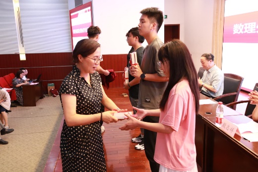 数理外国语联合党委书记钱慧敏向新生代表赠送书籍《中国共产党简史》和《大国来了》,并寄语全体新生:牢记时代使命,好好学习,积极实践,今天以学院为荣,明天学院以你为傲!