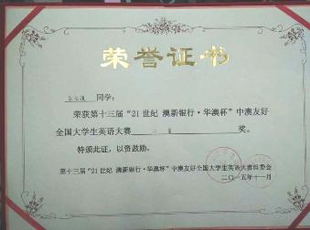 11月1日,第十三届 “21世纪 澳新银行•华澳杯”中澳友好全国大学生英语大赛在华东师范大学逸夫楼报告厅落下帷幕。我校管理学院的朱文琪同学在本次比赛中喜获二等奖。