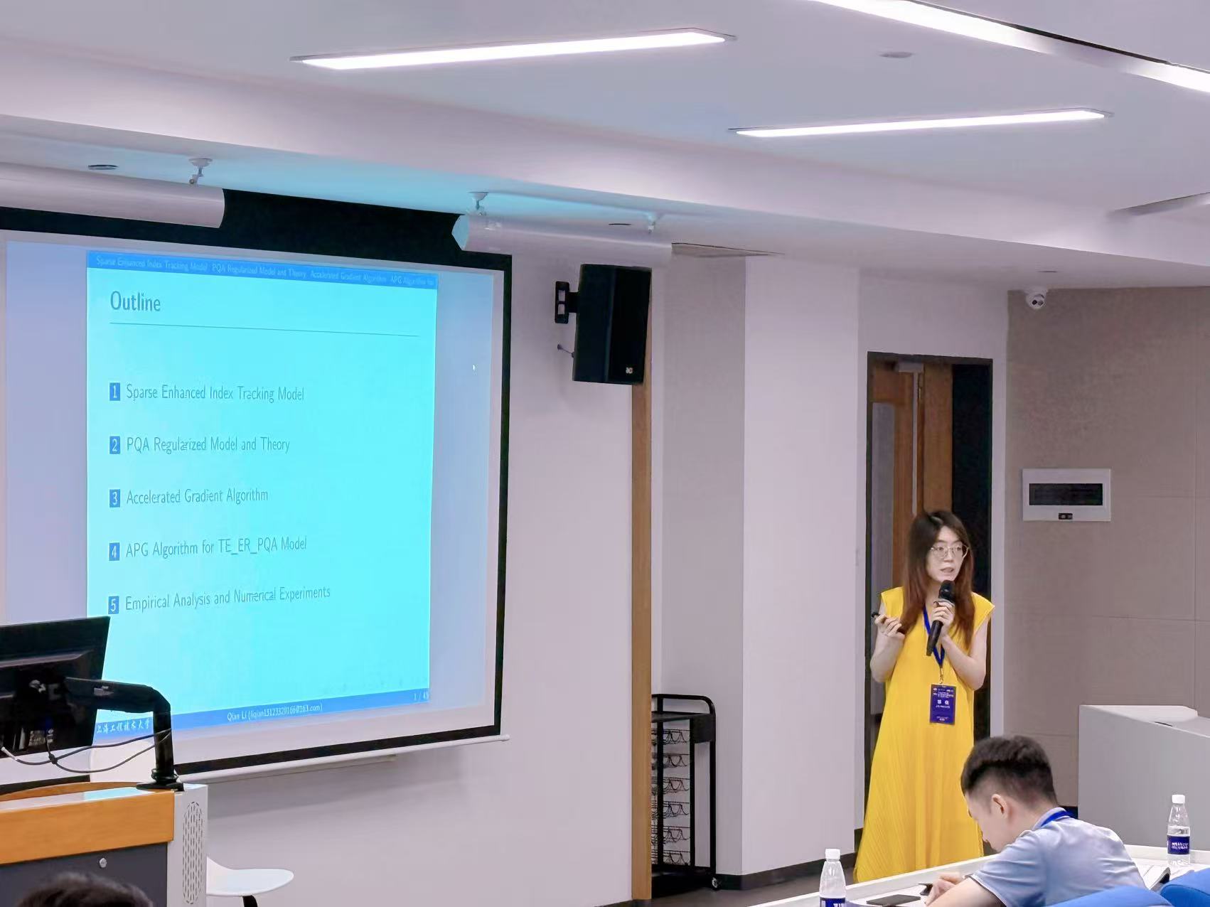 上海工程技术大学数理与统计学李倩副教授带领田浩楠同学参会。李倩老师以《A Sparse Enhanced Indexation Model with Non-Convex Regularization: Theory, Algorithms, and Empirical Superiority》为题做主题报告,提出了一种新型稀疏增强指数化模型(TE ER PQA),在理论上保证了最优性和稀疏性,实证中在多个市场阶段均有显著优越性。