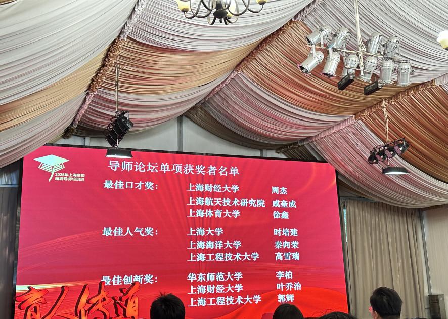 近日,由上海市教育委员会、上海市学位委员会主办,上海市教师教育学院与东方绿舟共同承办的2025年上海高校新聘研究生导师培训班圆满落幕。英国正版365官方网站研究生导师高雪瑞博士在培训期间表现突出,在“育人传道”导师论坛中荣获“最佳人气奖”。