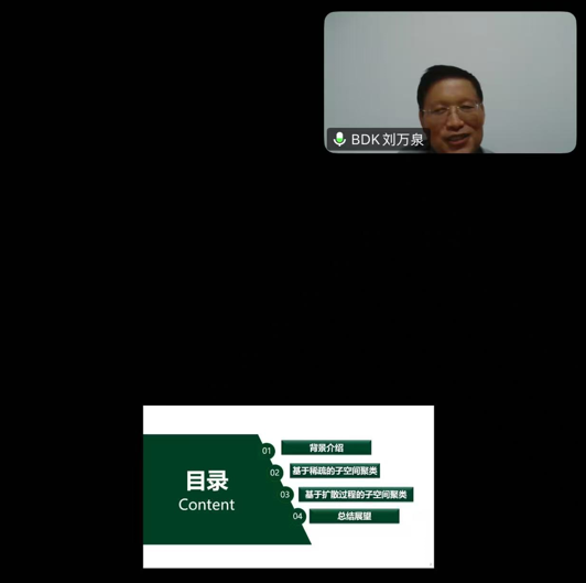 刘万泉教授从基于稀疏的子空间聚类和基于扩散过程的子空间聚类两个方面介绍了目前所研究的工作。报告中,刘教授从自身的经历出发,主要分享了研究不同聚类问题的学术思维过程以及学术研究的一些心得体会,内容详实。通过本次讲座,广大师生对于基于稀疏子空间与扩散过程的聚类问题研究有了更深刻的认识。