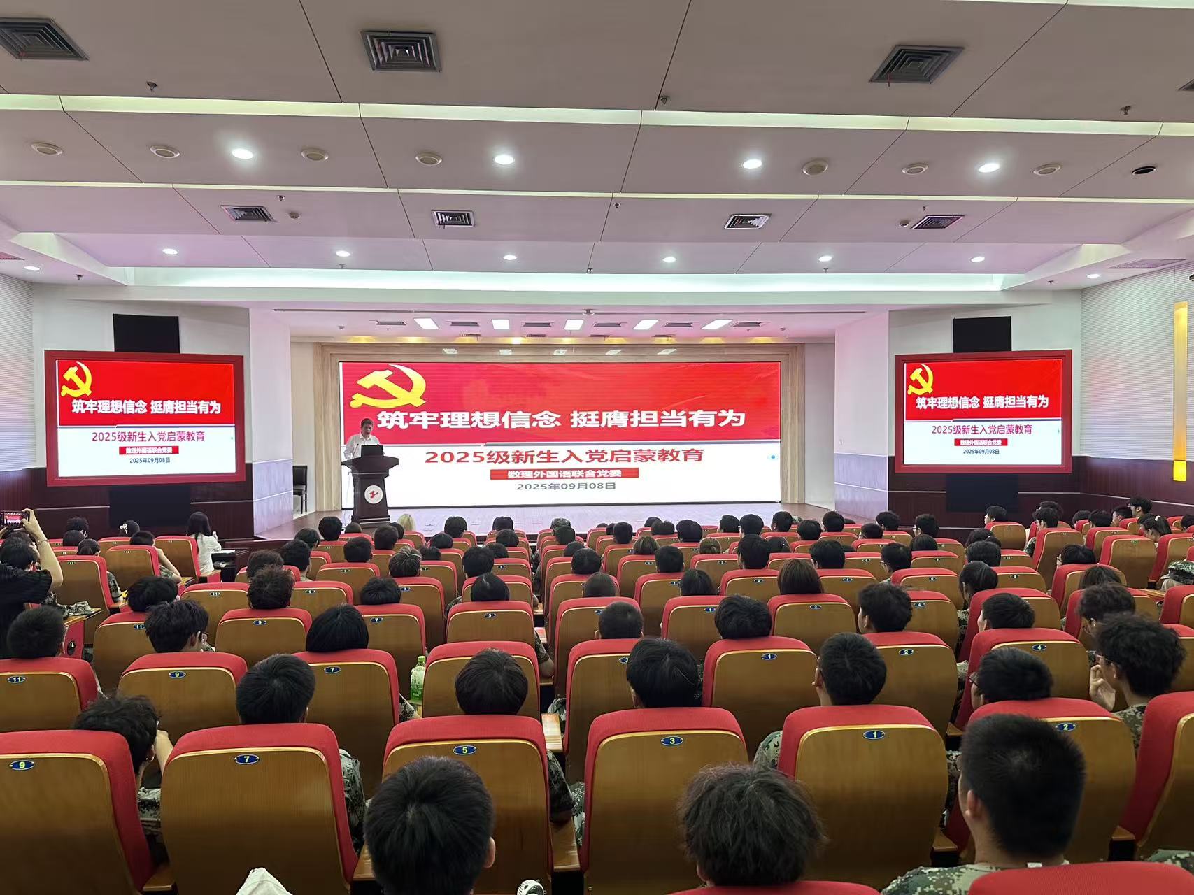 9月8日,数理外国语联合党委在图文信息中心开展新生入学教育,党委张朝民书记以“筑牢理想信念 挺膺担当有为”为题给新生讲入党启蒙党课。