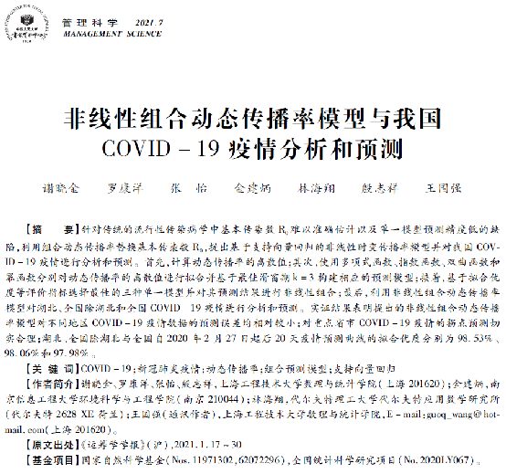 日前,从中国人民大学复印报刊资料数据库获悉,我校英国正版365官方网站商务统计学专业2019级研究生谢晓金作为第一作者发表在《运筹学学报》2021年第1期的论文《基于非线性组合动态传播率模型的我国COVID-19疫情分析与预测》被中国人民大学复印报刊资料《管理科学》2021年第7期全文转载。