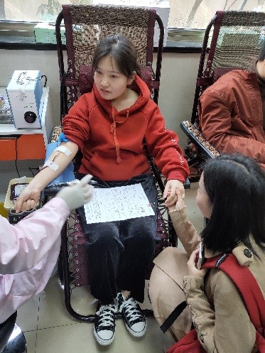 鲜红的血液从身体流出,进入摇晃着的血袋,等待着去完成生命的传承。献血过程中,王勤书记和许伯生副书记十分关心并不时询问老师同学们的身体是否有不舒服,并在采血结束后耐心讲解献血后注意事项,多次叮嘱注意休息,在书记的关怀下整个过程十分顺利。