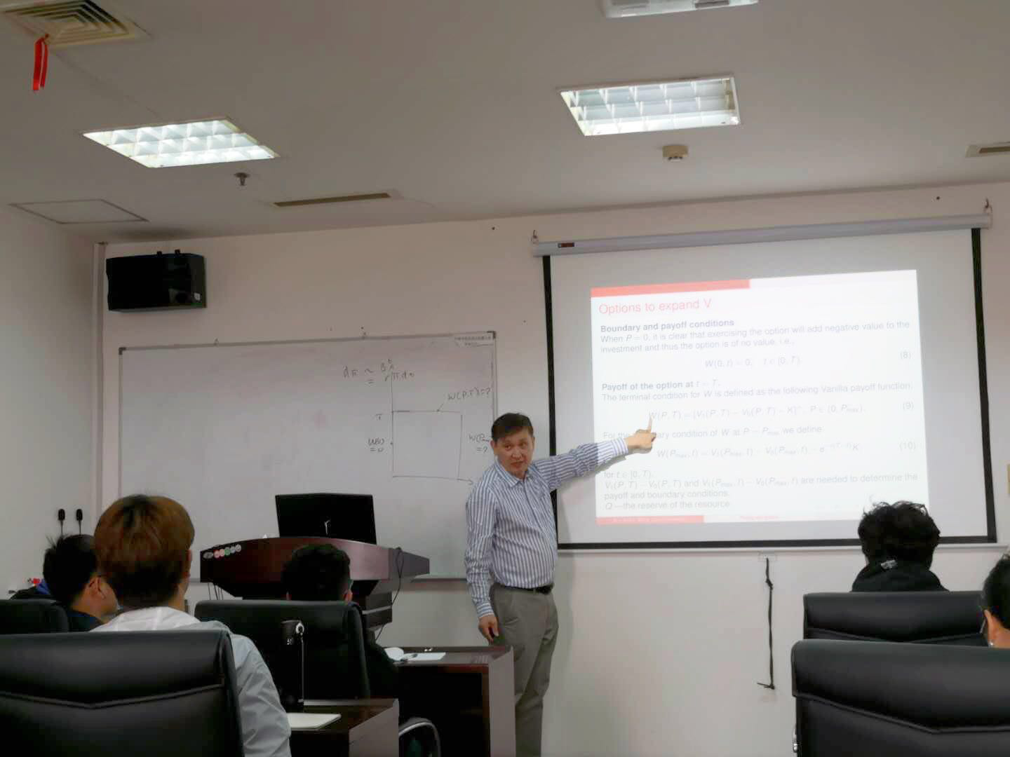 汪崧教授首先讲述了实物期权的发展历程及其基本概念。其次,汪教授重点讲解了扩展的期权定价模型。接着,汪教授分享了复合期权定价模型、欧式期权定价及评价偏微分方程的有限体积法。最后,汪教授给出了看涨及看跌期权定价模型的数值实验结果,并就该领域的进一步研究作了探讨和展望。汪教授的报告不仅为广大听众带来了期权定价模型的最新研究成果,而且开阔了大家的视野和思路。报告结束后,汪教授与参加讲座的青年教师和研究生就期权定价与最优化等领域的国际前沿和热点问题做了深入的交流与探讨。