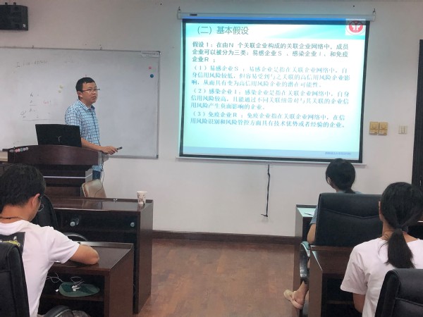李博士首先通过介绍关联信用风险的现实背景及相关研究现状引出管控策略对关联信用主体网络影响问题。接着,他着重介绍关联信用风险的相关概念,如何应用复杂网络和传染病模型构建关联信用主体网络中关联信用风险的传染演化模型,并从数学理论上证实管控策略对关联信用风险传染及关联企业网络稳定的影响。最后,李博士从有风险稳定和无风险稳定两种稳定状态,进而通过仿真实验证实管控策略对关联企业网络的稳定状态也有显著的影响,并探讨了关联信用风险未来的研究问题。李博士的报告内容丰富,讲解生动,给广大师生带来了关联信用风险研究领域的前沿和热点问题。报告结束后,李博士就传染病模型、大数据统计、关联信用风险和金融风险管理等热点研究领域同与会师生进行了深入探讨与交流。
