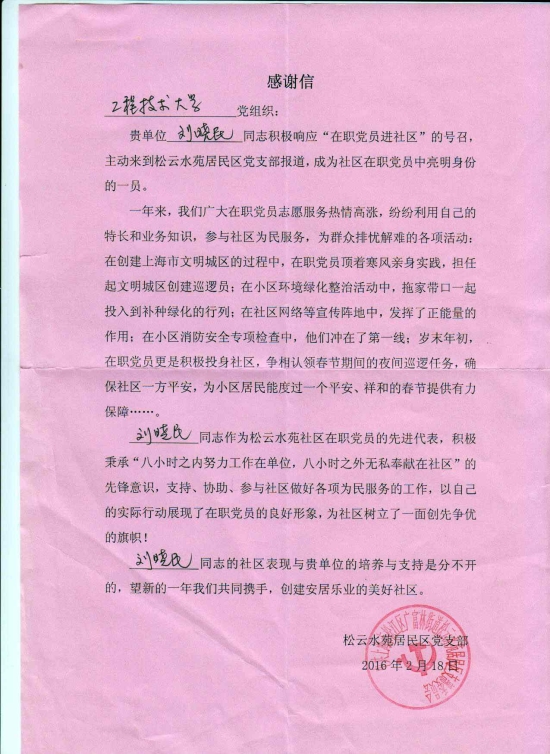 信中提到,刘晓民同志积极响应“在职党员进社区”的号召,主动来到松云水苑居民区党支部报道,成为社区在职党员中亮明身份的一员。一年来,利用自己的特长和业务知识,参与社区为民服务,为群众排忧解难的各项活动:在创建上海市文明城区的过程中,在职党员顶着寒风亲身实践,担任起文明城区创建巡逻员;在小区环境绿化整治活动中,带领一家人投入到补种绿化的行列;在社区网络等宣传正能量;在维护小区安全工作中,承担夜间巡逻和排查消防安全隐患任务,确保社区一方平安。