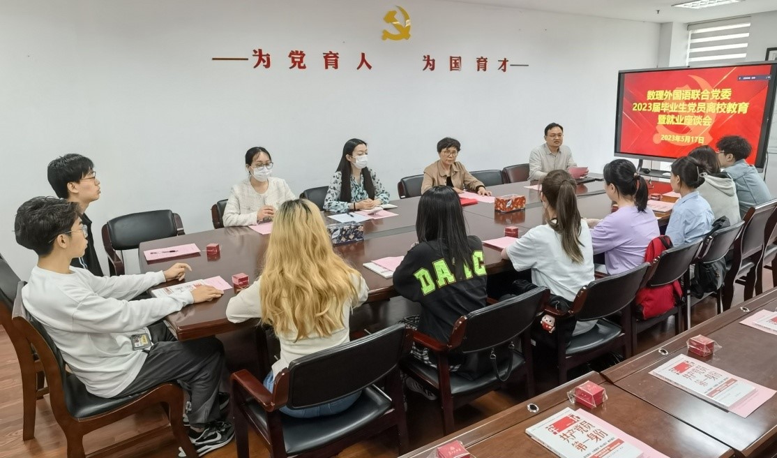 “学习新思想·奋进新征程·逐梦新时代”,5月17日,数理外国语联合党委在行政楼1308开展毕业生党员离校教育暨就业座谈会。数理外国语联合党委书记钱慧敏、副书记梅元媛、全体学生党支部书记、毕业生党员线下线上相结合参加会议。