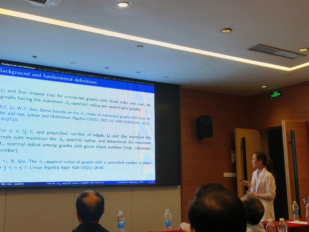5月19日至21日,我院青年教师魏薇参加了“2023广州代数图论及其应用研讨会”,并于20日下午做了题为“On the Aα-spectral radius of graphs with fixed size”的学术报告,分享了Aα矩阵中Brualdi-Hoffman型问题的最新研究成果。此次会议不仅拓展了与会人员对代数图论的发展现状及前沿问题的了解,还加强了我院学院青年教师与国内知名专家学者之间的学术交流。