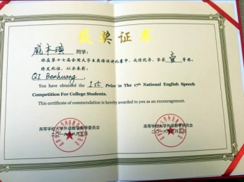 近日,我校2015级戚本璜同学在2016年全国大学生英语竞赛(NECCS)全国总决赛暨2016年全国大学生英语夏令营中获得了英语演讲比赛一等奖、英语风采大赛一等奖以及英语辩论赛二等奖等三项大奖。这是工程学子参加该项竞赛以来获得的最好成绩。