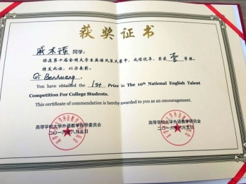 在教务处大力支持和指导下,基础教学学院高度重视外语学科竞赛。通过教学部组织发动,初赛选拔,重点辅导,戚本璜同学在王胜利教授全程一对一指导下,在上海赛区初赛中脱颖而出,又在全国众多高校近450名选手参加的总决赛中过关斩将,实现了工程大外语赛事全国奖项零的突破。基础教学学院按照学校继续开展做好学生“第二课堂”工作的要求,结合进一步提高外语课程教学质量,深化外语课程教学改革,将这项国家级竞赛作为工作重点之一,专门设立了竞赛组委会,多次开会研究,详细周密地布置好宣传、报名、通知和联络等准备工作,安排外语教师对选手进行初赛辅导和决赛针对性指导。学生通过参加竞赛,极大地提升了英语学习的兴趣及水平。
