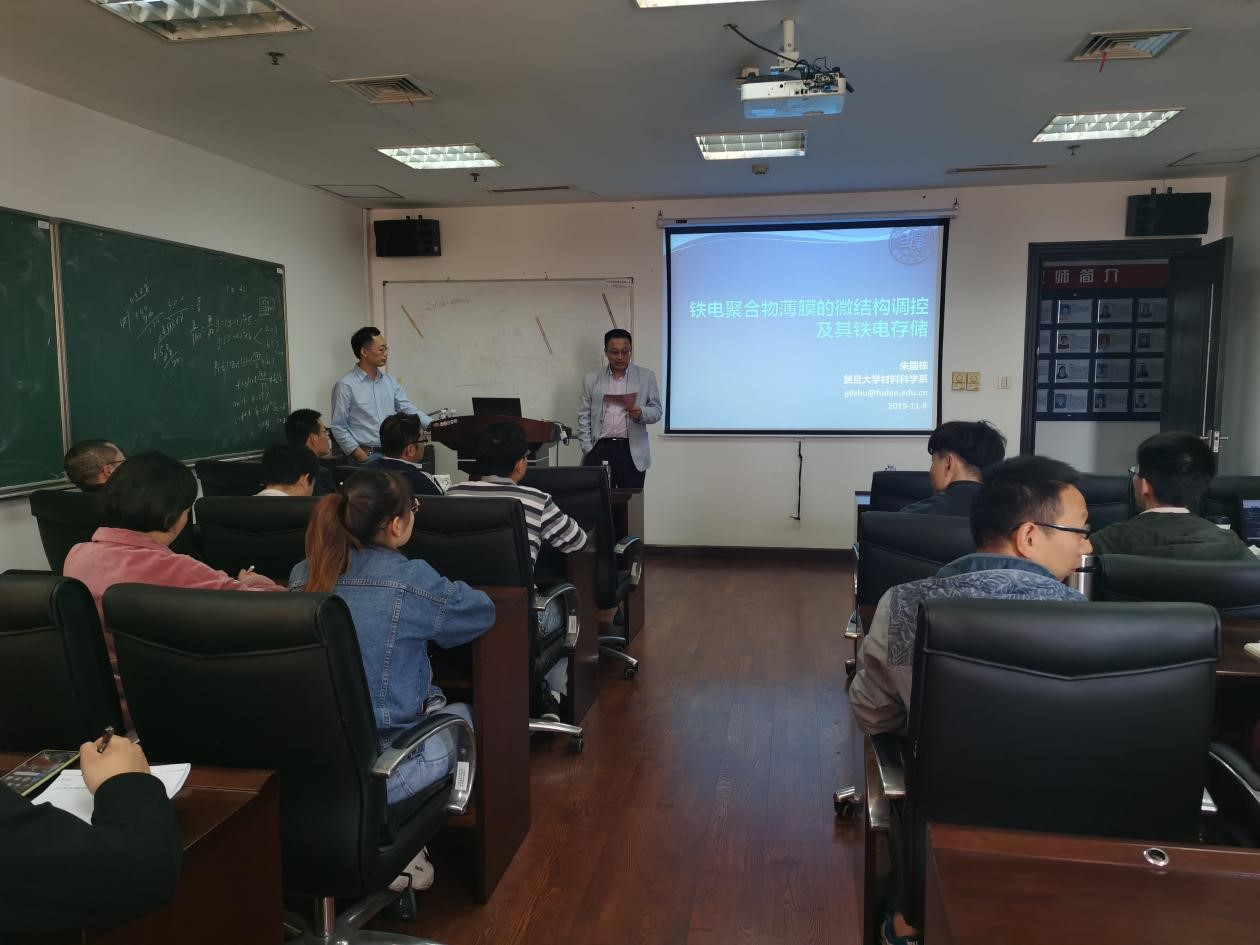 2019年11月8日下午13:00,复旦大学材料科学系朱国栋教授应邀来到上海工程技术大学,在行政楼1307学术报告厅做了一场精彩的学术报告。来自物理和材料等专业20余位青年教师以及研究生参加了本次报告会,会议由英国正版365官方网站院长殷志祥教授主持。