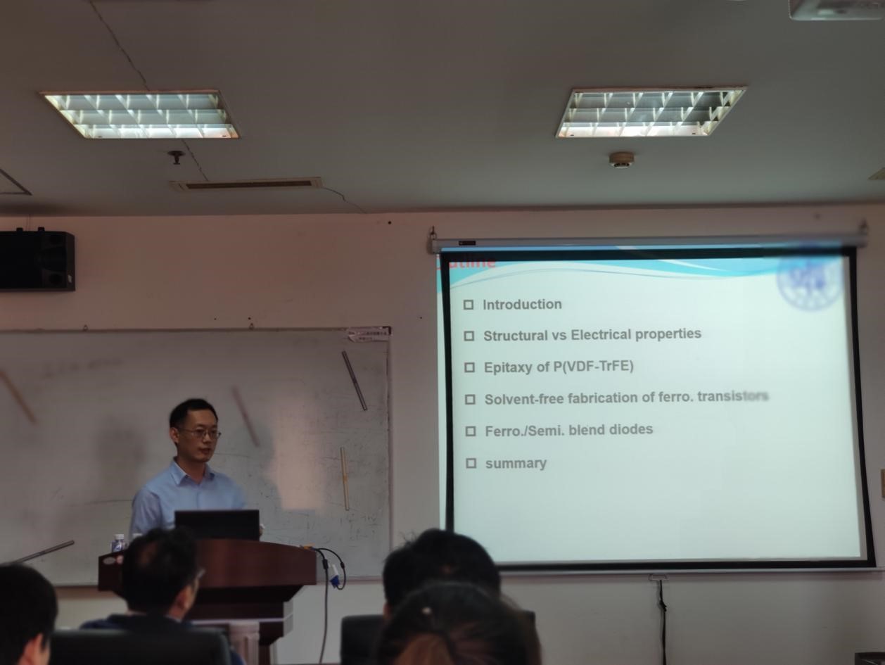 朱国栋教授以“铁电聚合物薄膜的微观结构调控及其铁电存储”为题展开论述。电介质或铁电材料最普遍的应用就是电容器,通过做成性能稳定、体积非常小的器件应用于我们日常的电子产品中,而深入理解材料背后的基础物理性质尤为重要。近两个小时的报告中,朱老师从铁电材料的性质和结构到有机铁电薄膜研究领域的最新进展,从制备高质量的铁电薄膜到可穿戴柔性传感器等器件的应用,围绕近期的研究成果,运用大量详实的实验曲线和丰富的微观结构分析数据,与大家分享了外延法制备的有机铁电薄膜性能,溶液法制备的有机铁电晶体管,以及有机铁电材料和有机半导体材料掺杂制备交叉对答(cross-talk)器件等研究工作。本次学术报告会,从理论到实验,与会师生一起探讨前言物理的正确打开方式,现场学术气氛热烈,更多科研灵感的火花在此碰撞和收获。