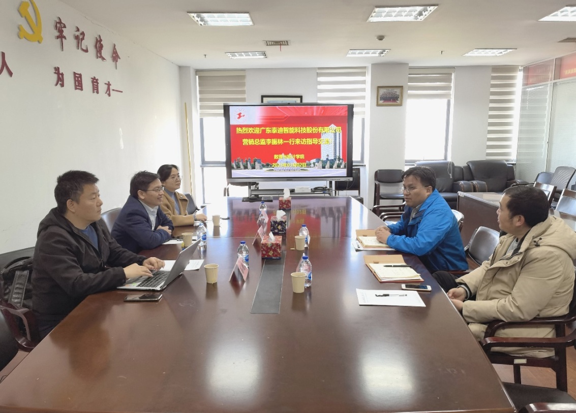 王国强院长介绍了近年学院发展的基本情况,李振林总监介绍了泰迪智能科技的整体情况,并提出与学院开展相关合作的具体意向。双方在校企合作模式、数据挖掘竞赛、创新工作室、产教融合教材、学生实习实训、模型交易平台等层面的合作互动模式进行深入交流。通过本次洽谈,找到了合作结合点,双方一致认为可以在相关领域展开广泛合作,发挥协同创新优势,深入推进校企产学研合作和产教融合,实现校企合作共赢。