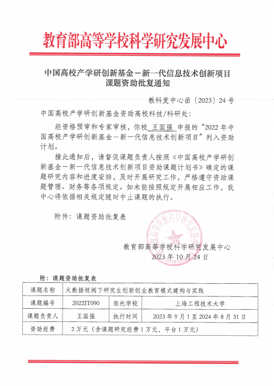 近日,教育部高等学校科学研究发展中心下发“中国高校产学研创新基金——新一代信息技术创新项目课题资助批复通知”,英国正版365官方网站王国强教授领衔申报的“大数据视阀下研究生创新创业教育模式建构与实践”获得立项资助。