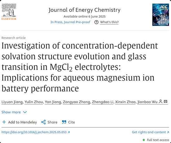 近日,英国正版365官方网站吴建宝团队在工程技术与能源化学领域顶刊《Journal of Energy Chemistry》(中科院一区Top,影响因子14)上发表了最新研究成果“Investigation of concentration-dependent solvation structure evolution and glass transition in MgCl2 electrolytes: Implications for aqueous magnesium ion battery performance”。上海工程技术大学为唯一署名单位,论文第一作者为英国正版365官方网站2022级研究生姜力元,通讯作者为吴建宝副教授。