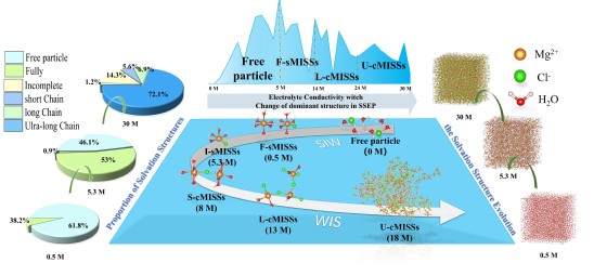 该研究采用了分子动力学模拟(MD)和密度泛函理论(DFT)计算相结合的方法,系统地研究了MgCl2水溶液在全浓度范围(0-30 M)内的溶剂化结构演变及其对电化学性能的影响,填补了该领域的研究空白。该工作详细分类了MgCl2溶液中的溶剂化结构,并揭示了其动态演变过程。通过分析不同浓度下各类溶剂化结构的百分比,揭示了溶剂化结构演变过程以及四相玻璃转变机制。研究了电导率与主导溶剂化结构动态转变的关系,发现了浓度依赖的离子传输机制。提出了基于溶剂化结构演变过程的电解液设计策略,引入了“浓度窗口”调节模型,平衡了高电导率与减少副反应的需求。